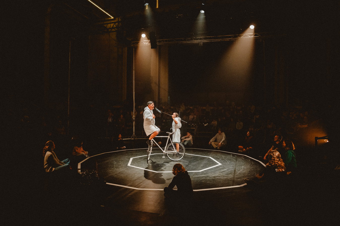 À la frontière entre cirque contemporain, théâtre et musique, Mentir lo Mínimo s’inspire du courant minimaliste et propose au public une création intime et épurée. Un spectacle qui, sous son apparente simplicité, nous rapproche de la complexité de l’acceptation de soi et travaille avec subtilité la question du corps. Mentir lo Mínimo cherche à se débarrasser de tout ce qui n’est pas nécessaire et parle du voyage de ces trois corps sur la scène : la femme, l’homme et le vélo.