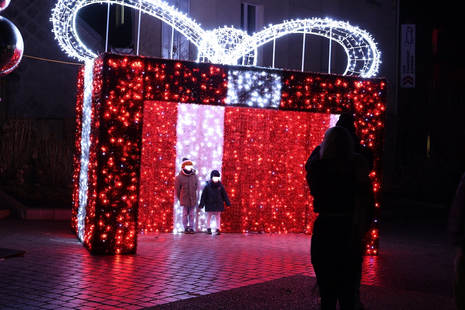 Deux décors 3D lumineux sur la place Saint-Germain pour se prendre en photo: le traineau du Père Noël tiré par un renne sur lequel on peut monter dessus et le cadeau géant 3D.