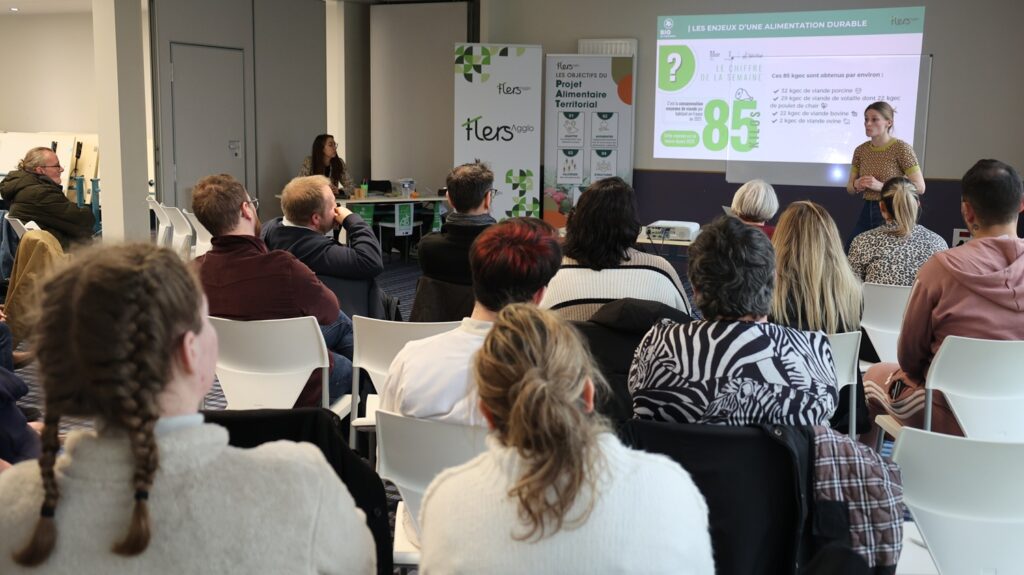 Huit sessions d’accompagnement sont prévues en 2026. La première session qui a eu lieu jeudi 15 janvier a consisté à présenter aux agents le Projet alimentaire territorial de Flers Agglo, le contexte et les résultats du diagnostic réalisé par le cabinet L.EVOLUTION, ainsi que l’accompagnement global qui leur sera apporté en 2026. Le personnel du GIP a également partagé un socle commun de connaissances sur laréglementation EGAlim et la notion d’alimentation durable. Étaient aussi présents cinq agents de la Ville de Flers et de Flers Agglo ainsi que deux agents du Groupement hospitalier de territoire (GHT) Les Collines de Normandie.