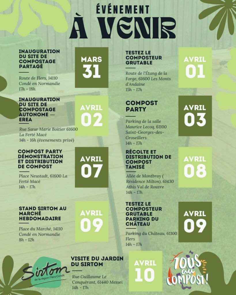Plus de 2 000 évènements auront lieu partout en France. Le Syndicat intercommunal de traitement des ordures ménagères (SIRTOM) de la région Flers-Condé s’engage pleinement dans cette édition avec 9 animations réparties sur l’ensemble du territoire pour promouvoir le compostage