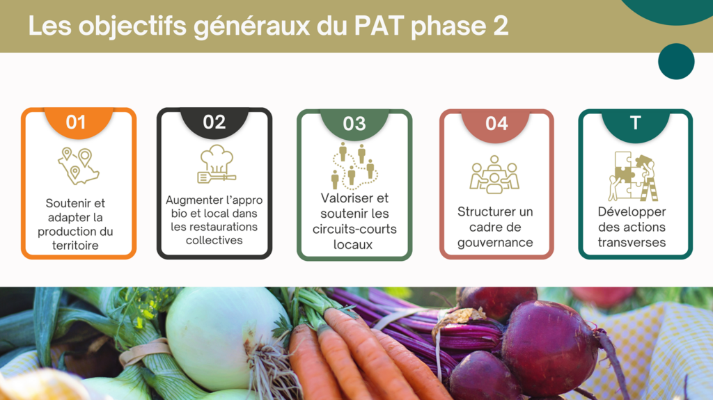 Pour ce faire cette nourriture doit être produite localement pour un bilan carbone le plus bas possible et une commercialisation en direct, c’est-à-dire avec le moins d’intermédiaires possible. Le PAT a pour ambition de favoriser la relocalisation de la production alimentaire sur son territoire notamment en soutenant l’installation agricole, en valorisant les producteurs qui favorisent les circuits courts ou en aidant les restaurations collectives à travailler avec des approvisionnements locaux.