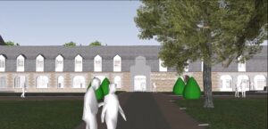 Côté étangs, l’impact environnemental de l’extension composée de bois, moellon et de verre sera le plus faible possible. Le toit de ce nouveau bâtiment sera en dessous du faîtage de l’ancienne mairie ce qui signifie qu’il sera invisible en arrivant dans l’avenue du château. Elle sera recouverte en verre émaillé où refléteront les feuilles des arbres et les eaux de l’étang. Ce nouveau bâtiment sera recouvert d’un toit végétalisé et sera doté d’un puits de lumière qui arrivera au niveau de l’accueil général. Il sera modulable au fil des années permettant de faire évoluer les espaces dans la durée, selon les besoins, grâce à une construction à technique de poteaux poutres (absence de murs porteurs).